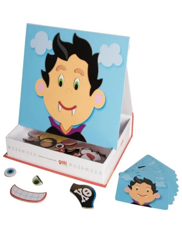 Vampire, pirate or class clown?! The imagination knows no boundaries. The facial outline can be filled with 66 magnetic parts. Anyone who cannot think of anything at first can get their inspiration from the template cards. Base plate: 20 x 26.5 x 5 cm