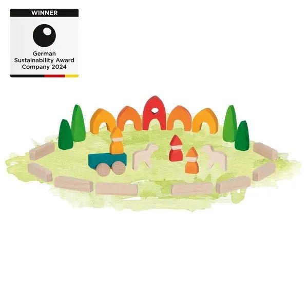 With goki evolution, selected wood qualities are combined with a harmoniously coordinated colour scheme. What all products in this line have in common is that they encourage creative play. The 25 wooden building blocks form a small village and yet they leave room for the child's own imagination. The bright colours do not hide the wood, but allow the structure to be seen. European craftsmanship at its best.