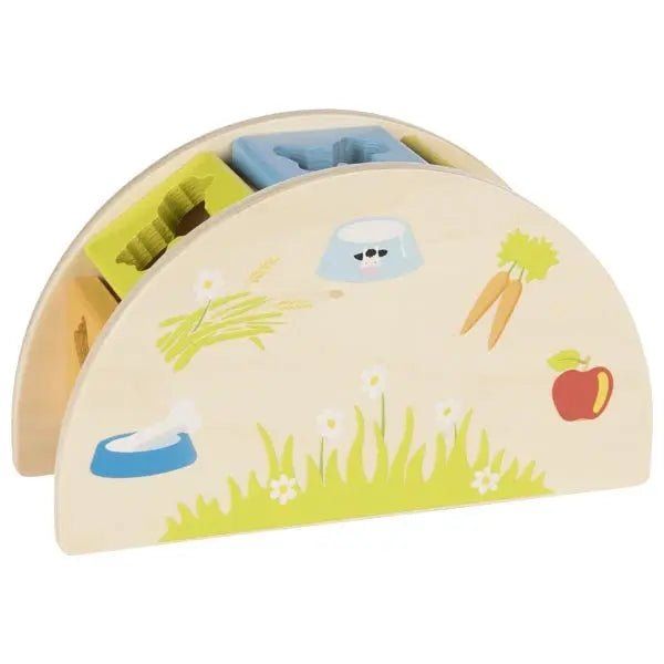 The simple motto of this shape sort box is: "Who eats what?" Its implementation is demonstrated by the obvious appreciation of all children who are starting to explore their environment with curiosity and to learn through playing by mastering challenges and thus developing their abilities. The elaborate design offers the necessary play element. Dimensions: 24 x 8.5 x 14 cm.